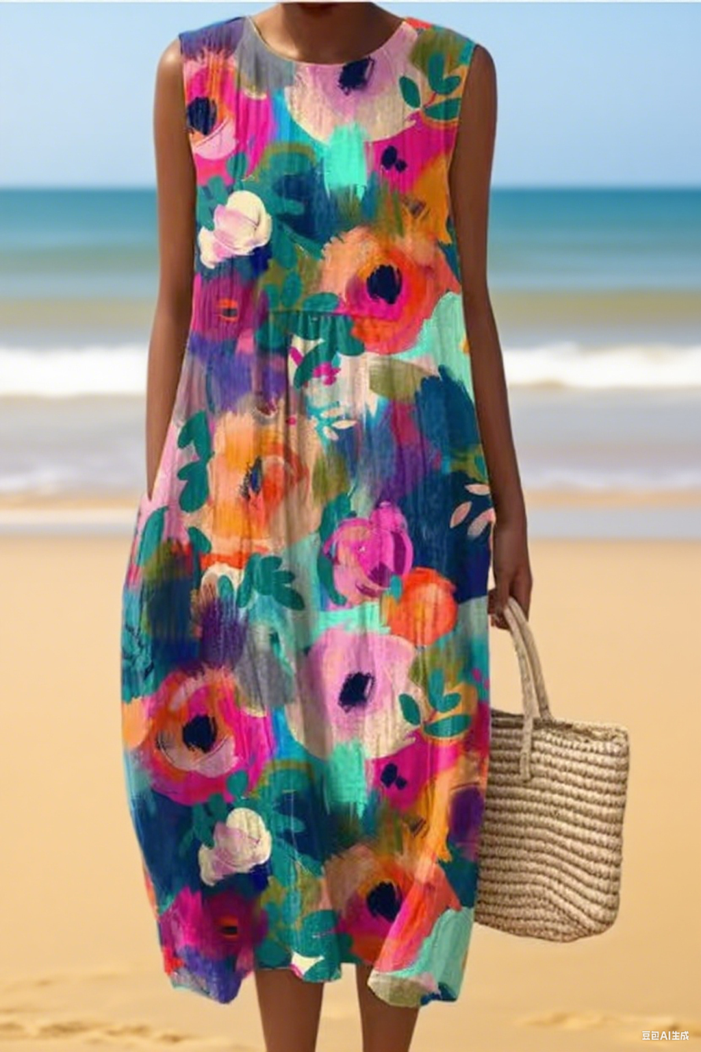Letní Dámské Šaty bez Rukávů s Kulatým Výstřihem – Lehký Bavlněný Komfort a Styl👗 Materiál: 80% bavlna, 20% polyester