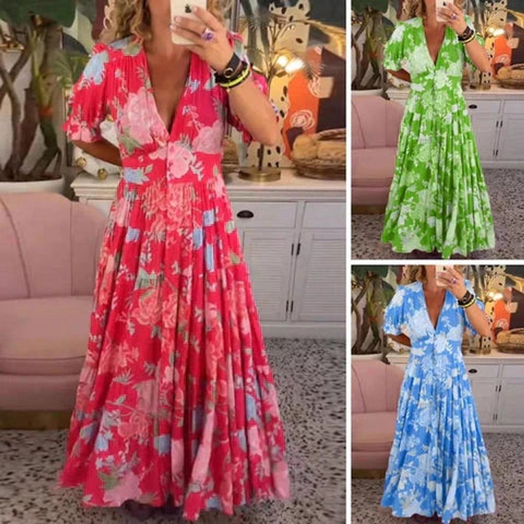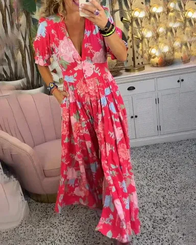 🌸 Pohodlné květinové volné maxi šaty s výstřihem do V a kapsami – Styl a Pohodlí na Každý Den! 🌸