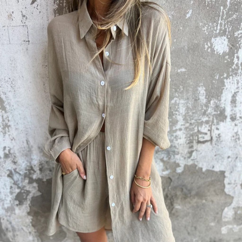 Ležérní a elegantní design - tato dvoudílná souprava obsahuje stylové tričko s dlouhým rukávem a odpovídající šortky, které dokonale kombinují pohodlí a módu. Skvěle se hodí na neformální procházky, pozdní snídaně nebo odpočinek doma.