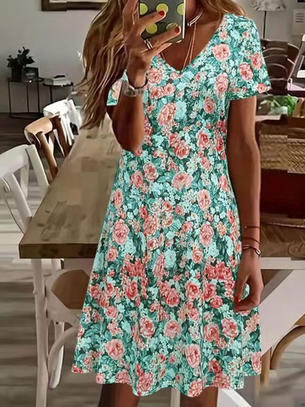 Květinové šaty s krátkým rukávem a výstřihem do V