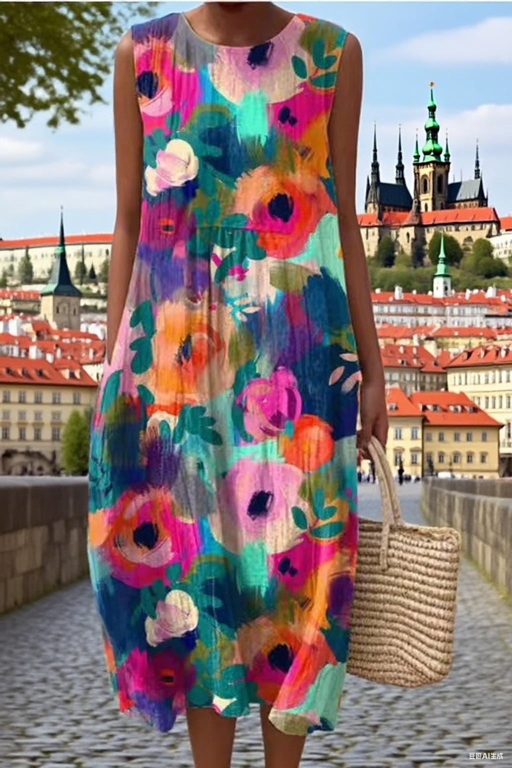 Letní Dámské Šaty bez Rukávů s Kulatým Výstřihem